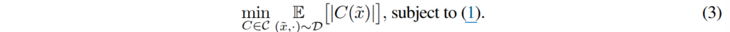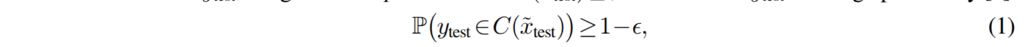 여기서 C는 가능한 모든 예측 방식(prediction scheme)의 집합, \mathbb{E}_{(\tilde{x}, \cdot) \sim D}[|C(\tilde{x})|]는 데이터 분포 D에 따라 입력 ~x에 대한 예측 집합 C(~x)의 크기의 기댓값. 즉, 평균적인 예측 집합의 크기를 의미합니다. subject to (1)은 수식 1에서 제시된 제약 조건을 만족해야 한다는 의미로 실제 정답을 포함해야하는 확률이 최소한 1-e이여야 한다는 의미를 가집니다.