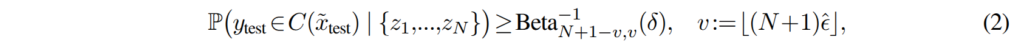 여기서 Beta^{-1}_{N+1-v,v}(\delta) 는 파라미터 N+1-v 와 v를 가지는 Beta 분포의 역 누적 분포 함수(CDF)의 \delta 분위수 수준을 나타냅니다. \hat{\epsilon}는 calibration에 사용되는 threshold입니다. 실제 실험에서는 적당한 크기의 calibration dataset (N = 400)과 \delta = 0.01을 사용하고, 원하는 1 - \epsilon 커버리지를 달성하기 위해 \hat{\epsilon} 을 조정합니다. 이를 통해 calibration set 샘플링에 대해 1 - \delta = 0.99의 확률로 원하는 커버리지를 얻을 수 있습니다.