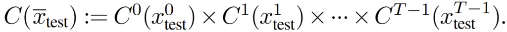 Causal reconstruction of C(x) at test time. single-step과 동일하게 test 중에는 z_test를 구하는 것이 어렵습니다. 가장 어려운 이유는 미래 정보를 결정하는 것이 매우 어렵다는 점입니다. 그렇기에 과거에 결정된 정보와 현재 시점의 후보 군들 이용해 casual manner (인과적인 방법; 시간 흐름에 따른 방식)을 제안 합니다. 각 step 간의 결정은 아래와 같이 각 스텝의 prediction set 간의 곱집합으로 표현 가능합니다.