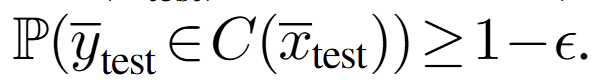 Calibration. 그 다음 먼저 1-e를 달성하기 하기 위해서 \hat{\epsilon} 를 조정하고 그 다음 quantile \hat{q} 를 얻습니다. 주어진 새로운 x_test로부터 1-e 확률로 y_test를 포함하는 calibration set C(~x_test)구성 할 수 있습니다.