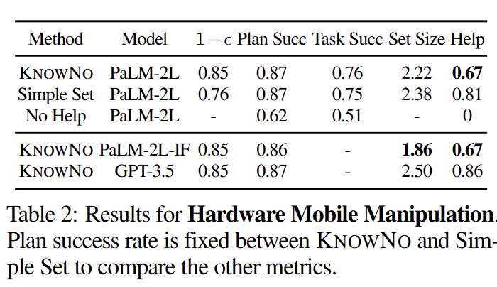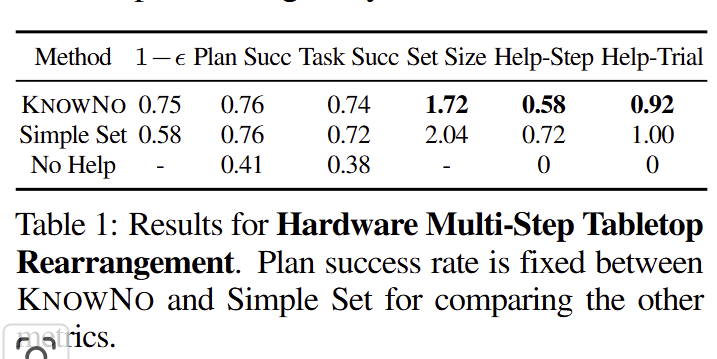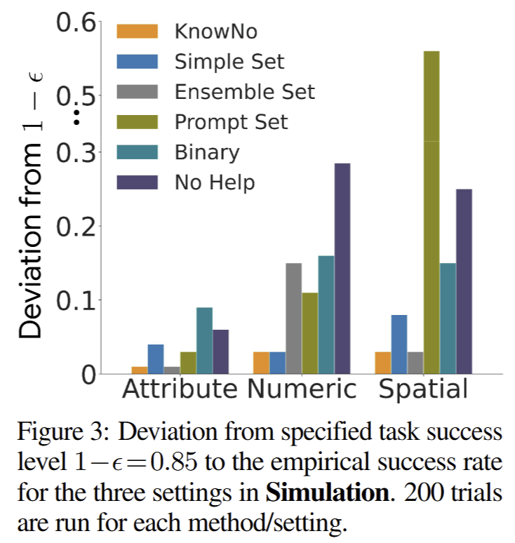 + 해당 실험을 통해 몇 가지 재밌는 결과를 볼 수 있음. prompt set이 LLM에게 결정을 맞기는 세팅임. 의미론적인 경향을 보이는 Attribute에서는 KnowNo와 동등한 편차를 보이나, 공간적인 특색을 보이는 상황에서는 가장 높은 편차를 보임.