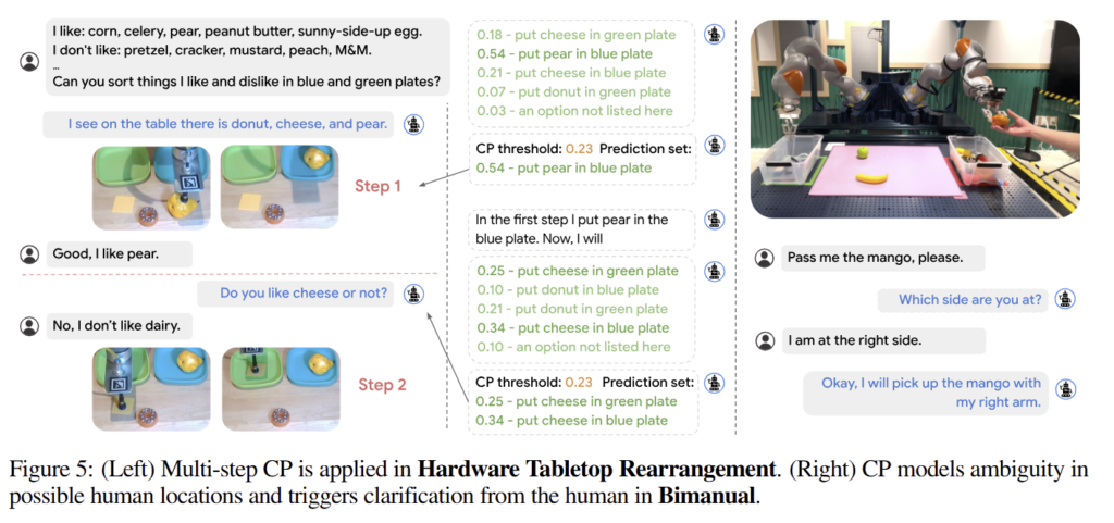 fig 5는 multi-step CP를 실제 Tabletop Rearrangement에 적용한 결과임. 중간 하단을 보면 CP 임계를 초과하는 문항이 두개가 등장하여 유저에게 도움을 요청하는 것을 볼 수 있습니다.
