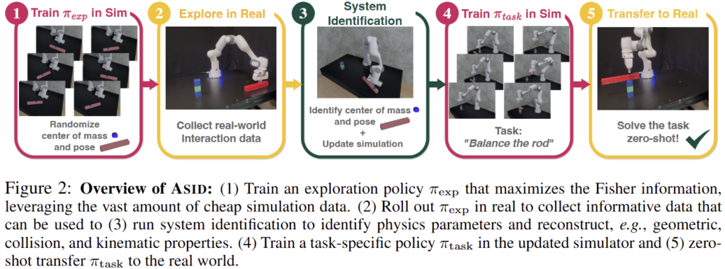 해당 논문은 system identification에서 영감을 받아, sim2real transfer의 핵심이 실제 세계에서 효과적인 시뮬레이터를 학습하는 것으로 보고, sim2real을 위하여 generic한 파이프라인인 ASID(Active Exploration for System IDentification)를 제안합니다. 해당 방식은 exploration과 exploitation을 분리하여 접근하며 아래의 순서로 이루어집니다.(강화학습에서 exploration은 알려지지 않은 새로운 환경이나 상태를 시도하여 환경애 대하여 새로운 정보를 얻는 과정을 의미하고, exploitation은 현재까지 알고있는 정보를 기반으로 가장 높은 보상을 얻을 수 있을 것으로 예상되는 행동을 선택하는 것을 의미합니다.)