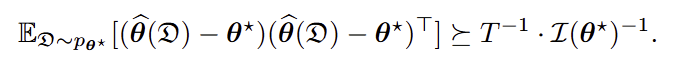 Cramer-Rao lower bound 에 따르면, \hat{\theta}(\mathcal{D})의 공분산은 아래의 식을 따릅니다.