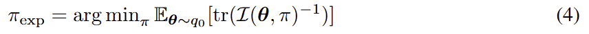 앞서 Fisher Information Matrix가 오차제곱 평균의 하한이 된다는 식 (1)에 따라 tr(\mathcal{I}(\theta^\star, \pi_{exp})^{-1}) 가 하한이 되므로, 아래의 식 (2)를 만족하는 exploration policy를 찾습니다.