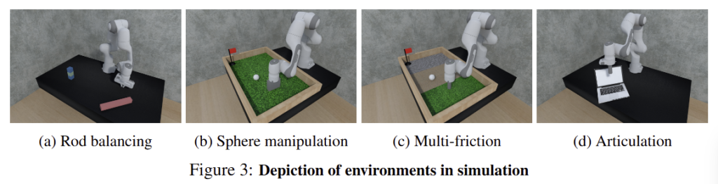 - 일반성을 어필하기 위해 질량과 마찰 등의 물리적 파라미터 뿐만 아니라 로봇의 관절 위치와 각도 등의 운동학적 구조도 고려하는 상황에 대한 평가를 수행합니다. (Figure 3-(d))