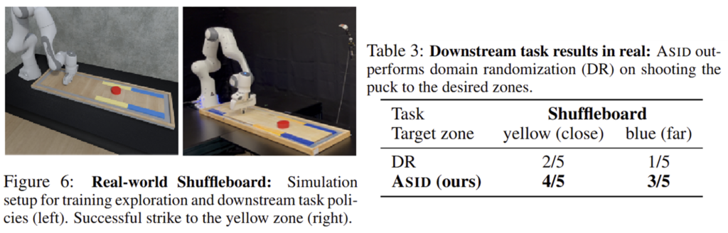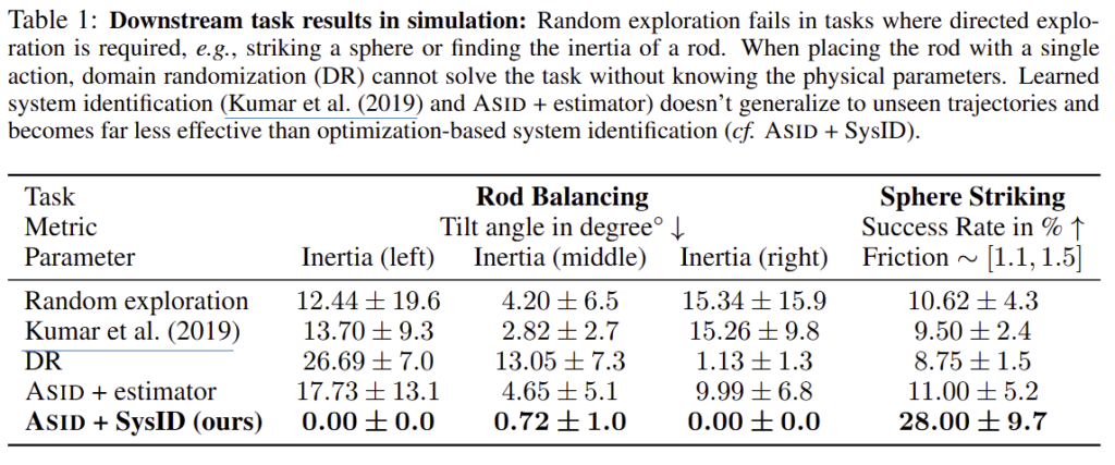 실험을 통해 저자들은 (1) ASID의 exploration 전략이 unknown 파라미터 식별을 위하여 충분한 정보를 제공하였는지? (2) 식별한 파라미터를 이용하여 ASID 성공적으로 downstream task에 대한 policy를 학습할 수 있는지? (3) ASID에서 제안한 패러다임이 실제 환경으로 전이 가능한지? 를 확인하고자 하였습니다.