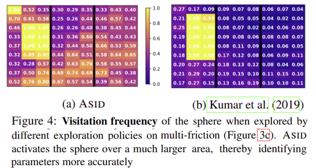 exploration에 대한 평가를 위해 여러 파라미터를 모르는 상황을 고려합니다. Figure 3-(c)에 해당하는 여러 표면이 존재하는 상황에서의 exploration policy에 대한 평가를 수행합니다. 아래의 Figure 4는 exploration 과정에서 공이 지나간 영역의 heatmap을 나타낸 것으로, 좌상단이 목표 지점, 중간 부분이 공의 시작점을 나타내는 것으로 보입니다. 저자들은 결과에 대하여 ASID 방식이 전반적인 영역을 고려하여 공을 타격하는 방식에 대한 학습이 이루어지는 반면, (b)는 시작 영역에서 다른 영역으로 효과적으로 이동시키지 못한다고 설명합니다.