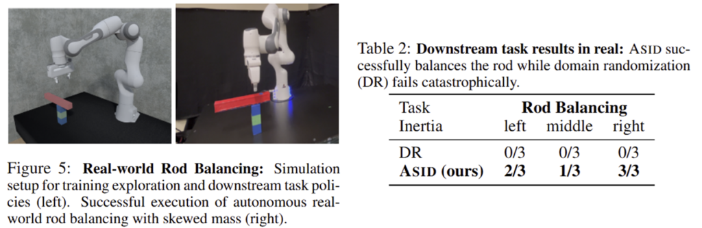 pick-and-place에 해당하는 downstream task로, 막대의 질량 분포와 관성, 마찰 계수 등을 모두 유추해야하며 실제 환경에서의 실험 결과를 통해(Table 2) ASID가 DR(domain randmoization)에 비해 성능이 개선되었음을 보였습니다.