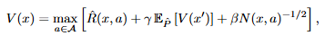 \hat{R}(x,a)은 exploitation 기반의 경험한 보상이고, \hat{P}는 그 transition 확률입니다. 여기서 마지막 항인 \beta N(x,a)^{-1/2}가 exploration에 대한 보너스로 방문 횟수가 적다면 보상을 크게 설정하여 가보지 않은 곳을 가보도록 유도합니다. 이 방식은 이론적으로는 정확도와 최적화가 보장된다고 합니다. 하지만, real world에서는 이러한 방식이 잘 작동되지 않는다고합니다. 그 이유는 상태 공간이 너무 크기 때문에 한번만 보고 두번은 다시 볼 수 없는 상태들이 너무 많고, 그러한 상태들의 방문횟수(N(x,a))는 1이하 이기에 exploration에 대한 보너스가 의미가 없어집니다. 이러한 단점의 해결을 위해 기존 방법론들은 \epsilon -greedy 전략을 통하여 이 문제를 해결하려고 했습니다. \epsilon -greedy 전략은 단순하게 랜덤하게 한번씩 행동들을 섞는 전략입니다.