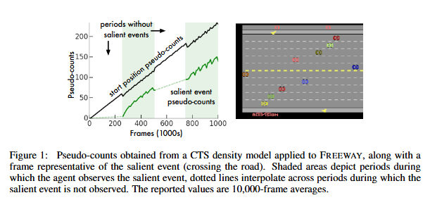 Figure 1.은 실제 FREEWAY게임에서의 예시입니다. 길건너친구들 게임과 같은 게임으로 지나다니는 차를 피해 무단횡단해야하는 게임입니다. 저자는 기대했던 5가지의 조건이 모두 충족되었으며 실제 count의 비율과 pseudo-count의 비율이 비슷함을 설명하며 exploration 전략으로 이 pseudo-count가 효과적임을 설명하고 있습니다.
