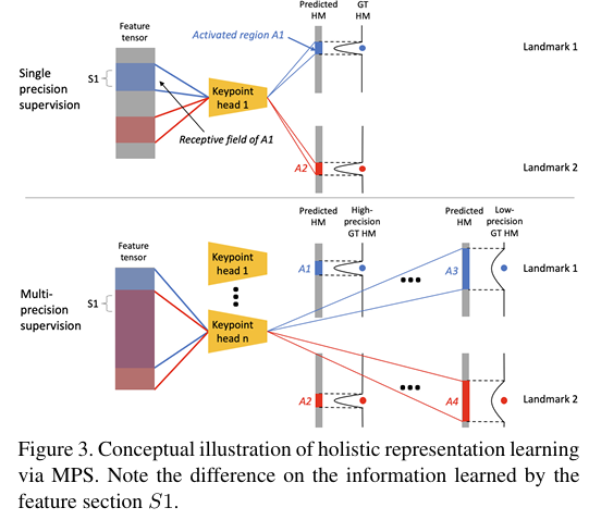 그림과 보시면 그림 상단의 부분이 히트맵이 하나로 결정되는 single precision supervision이고 보면 서로 다른 landmark에 대해 receptive filed가 feature tensor에서 겹쳐지 않는다는 것이 확인이 됩니다. 반면 하단에는 논문에서 제안하는 Multi-presion supervision의 방법이고 low precesion의 히트맵을 출력하기 위해서 keypoint head로 전달되는 receptive field가 두 landmark 사이에서 겹치는 부분이 생김을 알 수 있습니다. 이와 같은 경우 각 landmark에서 그려지는 low precision heat map에서 각 landmark의 위치를 함께 고려한 채 학습이 됩니다. 이렇게 학습을 함으로써 feature tensor는 각 landmark를 GT와 근사하게 예측되도록 하는 것 뿐만 아니라 조금 더 넓게 바라보면서 물체의 전체 자세를 고려한 학습이 가능해집니다.