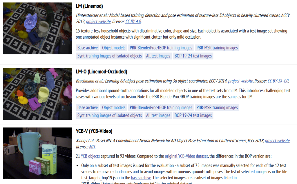 각 데이터셋은 아래와 같은 환경에서 촬영한 이미지로 구성됩니다. 각 데이터셋마다 특징이 다른데요 LINEMOD와 Occluded-LINEMOD는 같은 환경에서 촬영된 이미지를 사용하지만 LINEMOD는 하나의 객체에 대해서만 annotation을 제공하고 각 물체가 거의 가려지지 않은 이미지로만 구성돼 있습니다. 그와 반면 Occluded-LINEMOD는 모든 물체에 대해 annotation을 제공하고 때문에 물체 간의 occlusion이 발생하게 됩니다. Occluded-LINEMOD는 occlusion 상황에서도 모델이 정확히 자세를 추정하는지를 확인해볼 수 있는 적절한 데이터셋입니다.