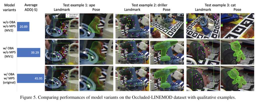 우선 본 연구에서 제안됐던 OBA, MPS 가 각각 성능을 향상시키는데 영향을 준 것인지를 확인하기 위한 실험이었습니다. 실험을 위해 두 방법 모두 적용한 original, OBA는 적용하지만 MPS를 적용하지 않는 방법의 MV1, OBA와 MPS 모두 적용하지 않은 모델인 MV2를 두고 각 모델에서의 자세 추정 결과를 비교합니다. 정량적으로 확인했을 때 (위 이미지의 좌측 막대 그래프 확인) 논문에서 제안하는 방법을 모두 적용한 original이 ADD(-S)의 평균이 45.95로 제일 정확하게 나왔습니다. 정성적인 결과를 확인해봤을 때도 두 방법을 적용하지 않는 경우 GT와 차이가 나는 정도가 크고 완전히 다른 엉뚱한 곳에서 추정된 것도 확인할 수 있습니다. 반면에 OBA, MPS방법을 적용한 것이 GT와 근사하게 예측됨을 확인할 수 있습니다.