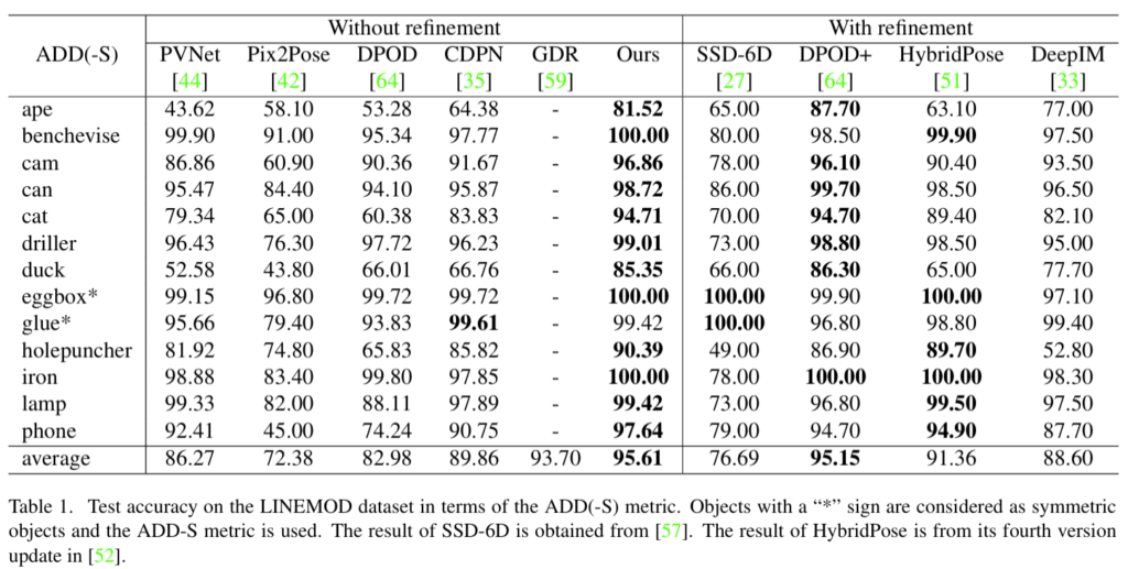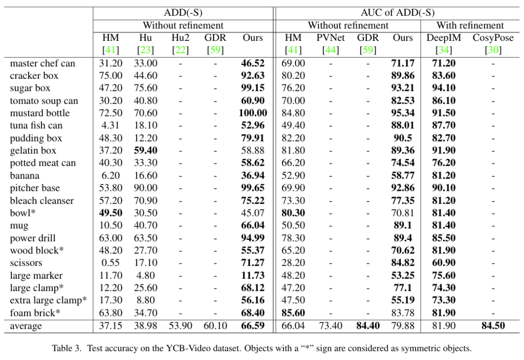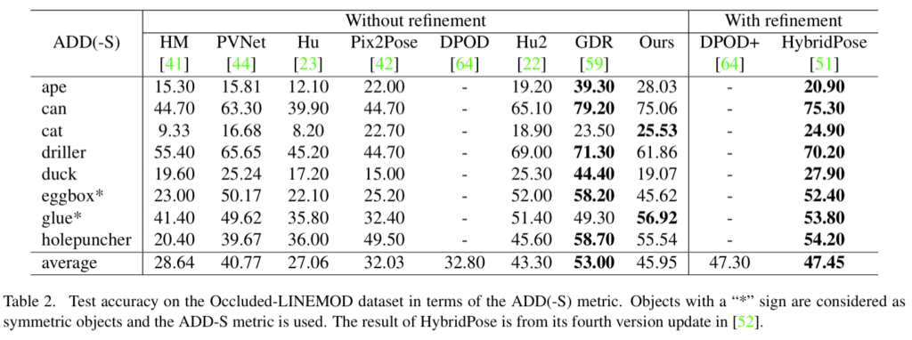 위 테이블은 LINEMOD에 대한 실험 결과입니다. 추가적인 조정 작업이 있는 모델과 없는 모델 통틀어서 논문에서 제안하는 방법론이 ADD(-S) 평균 값이 제일 높고 물체에 대한 개별적으로 보아도 대체적으로 본 연구에서 제안한 것이 높았습니다. 저자의 제안이 충분히 SoTA의 성능을 넘는다고 얘기할 수 있겠습니다.