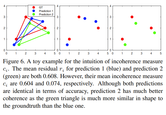 본 연구도 기존의 two-stage 방법론을 따릅니다. RGB 이미지에서 키포인트를 추정한 후 RANSAC 기반의 PnP solver로 예측한 키포인트와 mesh model에서의 키포인트간의 변환 관계를 (R, t: 회전과 평행이동 변환 행렬) 구하는 방식으로 나뉘어서 자세 추정이 진행됩니다. 기존의 two-stage 방법론 에서도 occlusion에 강인하도록 여러 방법이 시도가 됐었는데요 특히 two-stage에서 제일 먼저 선행되는 키포인트 검출을 할 때 앞서 리뷰했던 PVNet에서 처럼 특징을 추출하는 네트워크를 통과하고 나온 feature map이 업샘플링을 통해서 원본 이미지와 같은 크기를 갖도록 하고 각 픽셀이 원본 이미지에서의 위치를 그대로 보존하도록 하면서 각 픽셀값을 이용해 pixel-wise하게 키포인트를 추정하는 방식이 있었습니다. 하지만 저자가 지적하기로는 이 경우 각 키포인트에 대해서 독립적으로 추정이 되기 때문에 최종적으로 추정되는 키포인트가 coherence하지 않게 되는 게 한계였습니다. (키포인트가 coherent 하지 못하다는 것은 GT 키포인트들간이 이루는 그 분포와 차이가 크다는 것입니다) 아래 그림을 참고해서 설명을 하면 빨간색 landmark를 GT라고 했을 때 초록색의 prediction 2가 파란색의 prediction 1보다 더 나은 coherence를 갖는다고 얘기할 수 있습니다.