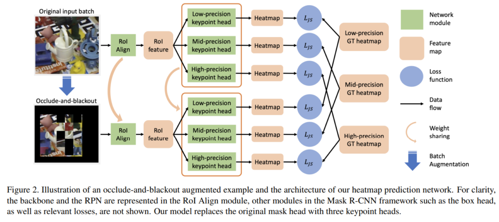 이 논문의 contribution을 정리하자면 여전히 two-stage 방법론이 occlusion 에 취약하다는 점을 문제 삼고 이를 개선하기 위해 총 두가지의 방법을 제안합니다. 논문에서는 해당 방법을 Robust Object Pose Estimation (ROPE)라고 간단히 지칭하고 다음과 같이 나뉩니다. 첫번째, occlusion에 강인하게 특징이 추출되도록 하는 방법인 OBA를 제안하였는데요 이는 hide-and-seek, random erasing, batch augmentation의 방법에 착안한 것으로 새롭게 occlude-and-blackout batch augmentation를 적용한다는 방식입니다. 두번째로는 모델이 예측하는 landmark가 보다 나은 coherence를 갖도록 하는 multi-precision supervision 아키텍쳐(MPS)를 제안하였습니다. 그럼 다음 절에서는 각 방법에 대해 조금 더 자세하게 살펴 보도록 하겠습니다.
