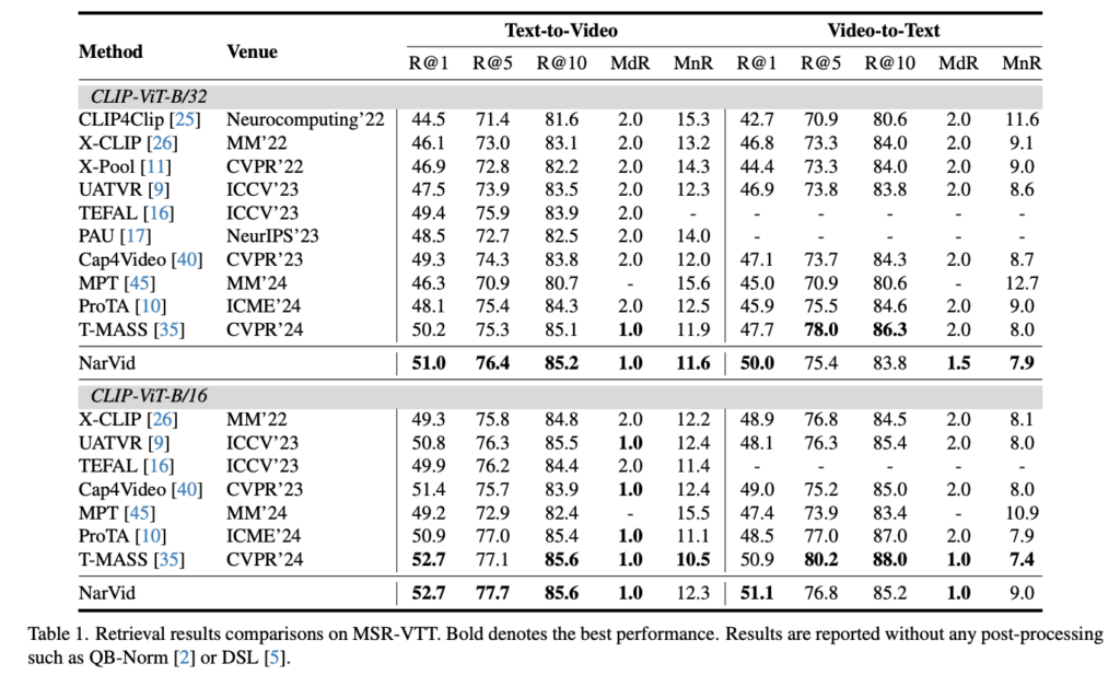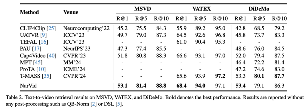 NarVid는 MSVD, VATEX, DiDeMo 세 데이터셋에서도 일관된 성능 향상을 보였으며, 특히 VATEX에서는 긴 질의와 다양한 속성 정보가 내레이션과 잘 맞아 가장 큰 성능 향상을 기록했습니다. 반면 MSVD와 DiDeMo에서는 query가 짧거나 정적인 영상 특성 때문에 상대적으로 향상 폭이 작았으며, 이는 내레이션 정보로 인한 성능 향상이 제한되는 상황을 보였다고 합니다.