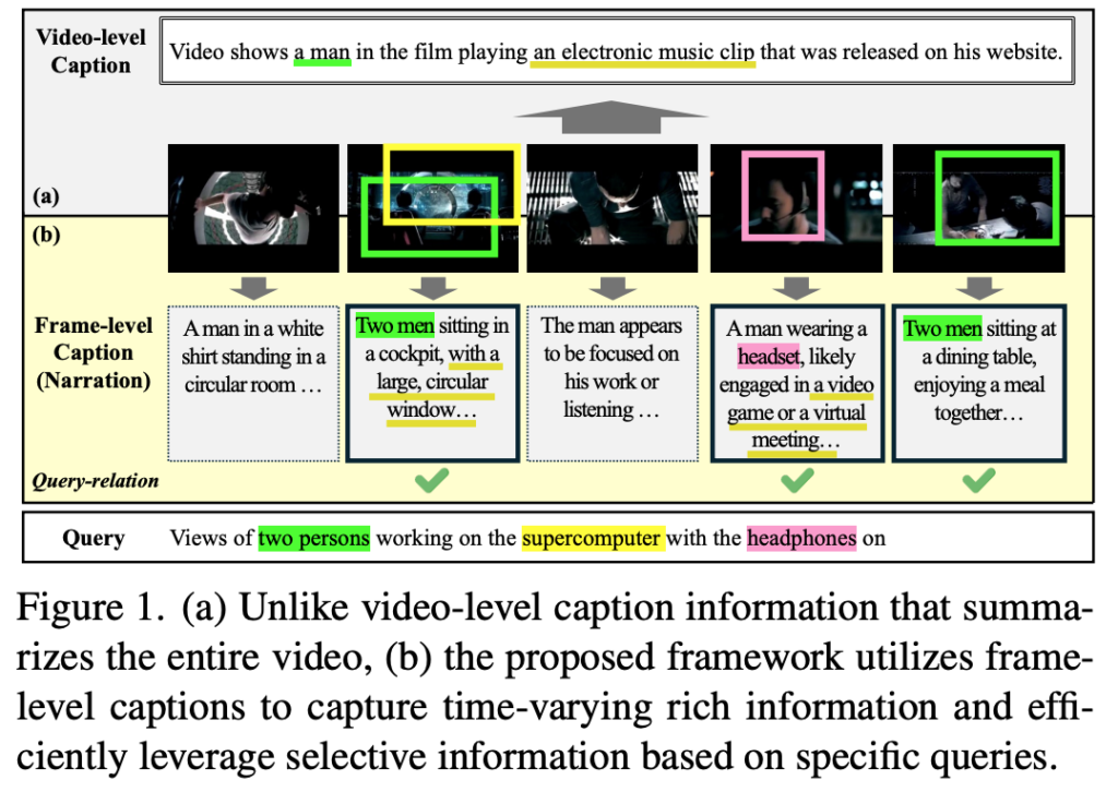 - 반면 그림 1(b)는 Frame-level 로 생성된 여러 개의 Caption을 통해, ‘헤드셋을 쓴 남성’, ‘조종석에 앉은 두 사람’, ‘하얀 셔츠를 입은 남성’ 등 각기 다른 시점에서 나타나는 객체와 속성을 포착할 수 있습니다. 이렇게 세분화된 캡션이 있다면 모델은 query와 직접적으로 관련 있는 정보를 선택적으로 사용할 수 있겠죠