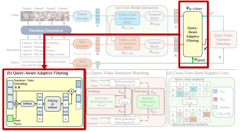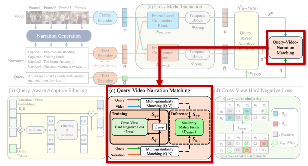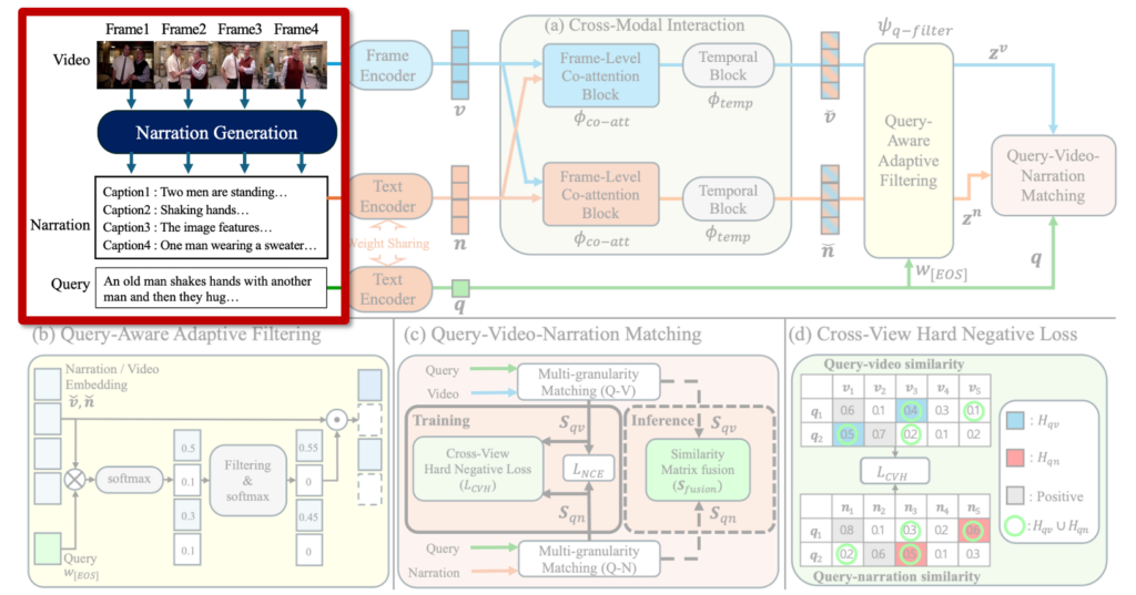 따라서 이 그림을 기반으로, 비디오 전 구간에서 생성한 frame-level caption을 내레이션(narration)으로 활용하는 NarVid(Narrating the Video)를 제안하였습니다. 구체적으로 설명드리자면, 단순히 캡션을 사용하는 데 그치지 않고, (1) 비디오와 내레이션 간 상호작용을 통한 feature 보강, (2) query에 기반한 중요 정보 필터링, (3) query-video 및 query-narration 유사도 결합, (4) 두 관점을 활용한 hard negative 학습까지 내레이션을 통합하였다고 합니다.