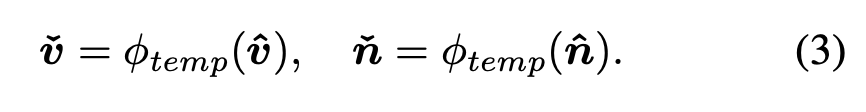 추가적으로 시간적으로 변화하는 정보를 보강하고자 temporal Cross-Modal Interaction을 통해 생성된 frame-level feature 시퀀스 \hat{\boldsymbol{v}} = (\hat{f}_1, \dots, \hat{f}_K), \quad \hat{\boldsymbol{n}} = (\hat{c}_1, \dots, \hat{c}_K) 는 각각 temporal block \phi_{temp}을 통과합니다. 상단 수식 (3)과 같은데 이는 *CLIP4clip에서 사용한 기법을 사용하였습니다.