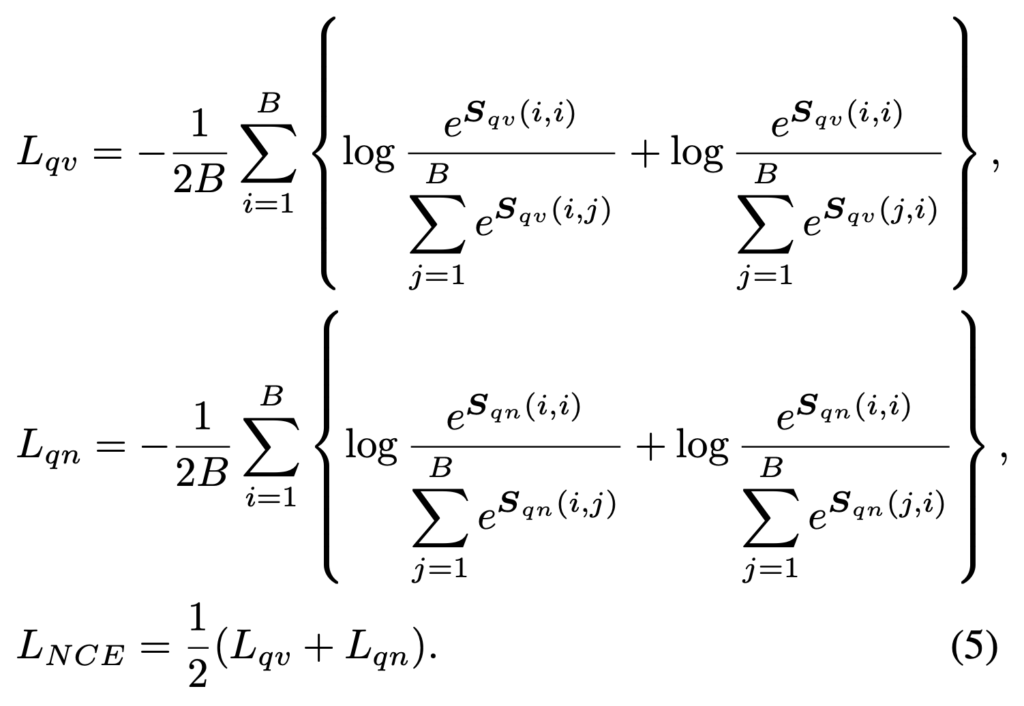 이 유사도 행렬은 각각 inter-modality (query ↔ video)와 intra-modality (query ↔ narration) 간의 관계를 나타내며, 본 논문은 두 관점 모두를 고려하여, 아래 수식(5)와 같은 Contrastive Loss를 제안하였습니다.