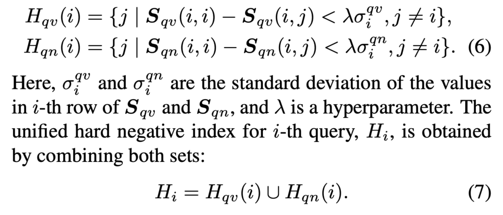 NarVid에서는 이러한 한계를 극복하고자, 두 관점을 모두 활용한 cross-view hard negative loss를 새롭게 제안합니다. 저자는 아래 수식 (6)과 같이 query q_i에 대해 다음 두 가지 유사도 행렬 기반의 hard negative 정의하였습니다