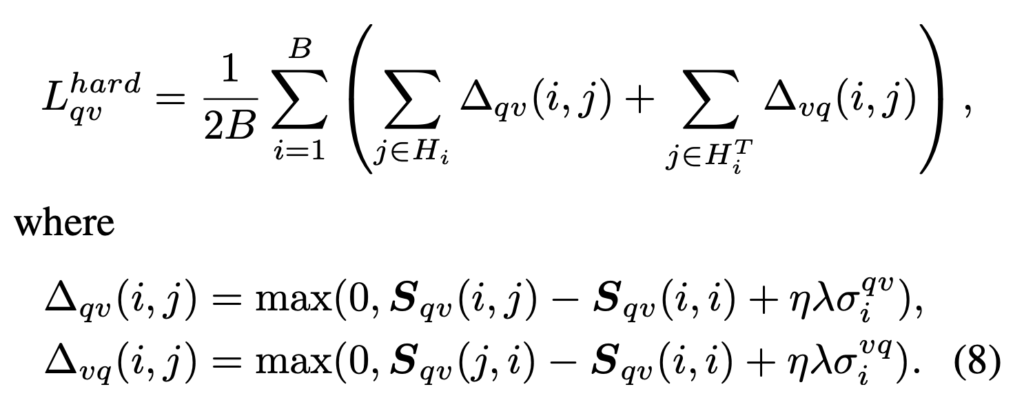 예를 들어, query-video 쌍에 대한 hard negative loss는 아래 수식 (8)과 같이 정의되는데, 여기서 \eta는 margin 스케일링을 위한 계수입니다.