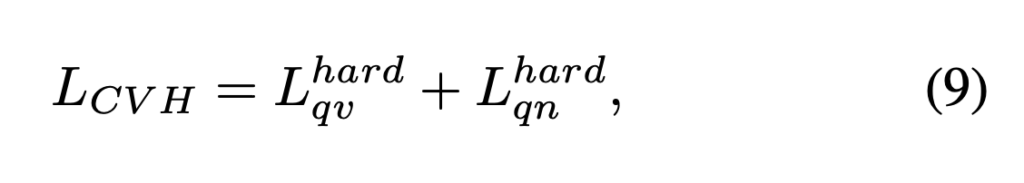 이를 통해, 정답보다 유사도가 높은 hard negative가 발생하지 않도록 보장하면서, 더 큰 margin을 확보하는 방향으로 학습이 진행되도록 유도하고자 하였습니다. 그리고 Query-narration 쌍에 대해서도 동일한 방식으로 \mathcal{L}_{qn}^{hard}를 정의하며, cross-view hard negative loss는 다음과 같이 정리할 수 잇습니다.