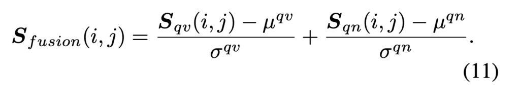 이를 방지하기 위해, 두 유사도 행렬은 각각 평균과 표준편차로 정규화한 뒤 결합하였습니다. 최종 유사도는 다음 수식과 같습니다.