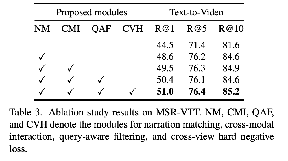 (Table 3) Narration matching만 적용했을 때도 R@1이 4.1% 상승하며 내레이션 정보가 매칭 과정에서 보조적인 역할을 수행함을 보여주지만, Cap4Video 대비 낮은 성능은 단순한 캡션 활용만으로는 한계가 있음을 보였습니다. 반면, co-attention과 temporal block을 포함한 video-narration cross-modal interaction을 적용했을 때는 모든 지표에서 성능이 향상되며, 내레이션의 시간적 정보와 모달 간 상호작용을 활용하는 것이 retrieval 성능에 핵심적임을 확인하였다고 합니다.