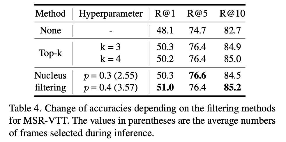 (Table 4) Query-aware adaptive filtering은 query와 무관한 정보나 오류를 제거해 성능을 높이는 데 효과적이며, 고정된 top-k 방식보다 nucleus 기반의 adaptive filtering(p=0.4)이 더 높은 R@1을 기록하며 효율적인 것으로 나타났습니다.