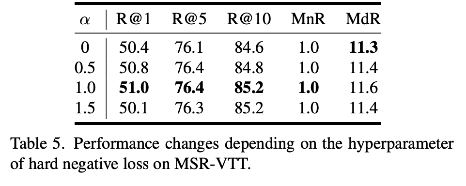 (Table 5) Cross-view hard negative loss는 intra/inter-modal 관점 모두에서 유사한 Hard Negativee 샘플을 학습에 반영해 모델의 판별력을 높이며, 하이퍼파라미터 α=1일 때 가장 좋은 성능을 보여 적절한 비율의 hard negative 활용이 중요함을 확인할 수 있었다고 합니다.