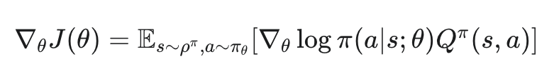 일반적인 Policy Gradient 알고리즘들은 주로 확률론적 정책 π(a∣s;θ)를 사용합니다. 이는 상태 s가 주어졌을 때 행동 a를 선택할 ‘확률’을 출력합니다. 이 확률 분포에 따라 행동을 샘플링하여 환경과 상호작용하고, 얻어진 보상을 바탕으로 좋은 결과를 낸 행동의 확률은 높이고, 나쁜 결과를 낸 행동의 확률은 낮추는 방향으로 정책 θ를 업데이트합니다. 확률론적 정책의 경사는 보통 아래과 같은 형태로 나타납니다.