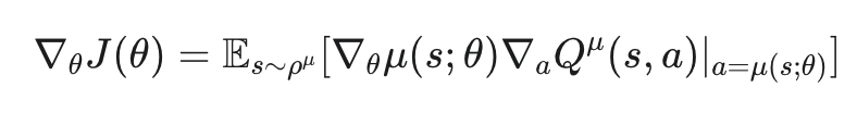 여기서 logπ(a∣s;θ) 항 때문에 확률적인 샘플링이 필요하고, 이로 인해 그래디언트 추정치의 variance가 커지는 문제가 발생할 수 있습니다. 따라서 Deterministic Policy Gradient는 확률 분포를 출력하는 대신, 주어진 상태 s에 대해 하나의 특정 행동 a를 직접 출력하는 Deterministic Policy μ(s;θ)를 사용합니다. 결정론적 정책 μ(s;θ)의 파라미터 θ에 대한 목적 함수 J(θ)의 그래디언트는 아래와 같이 표현될 수 있습니다.