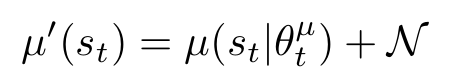 DQN의 장점을 살리면서 연속 행동 공간에서 학습할 때 또 해결해야 할 포인트는 exploration이었다고 합니다. DQN에서는 epsilon-greedy 정책을 사용해 exploration을 진행했습니다. DDPG 역시 exploration 개념이 적용돼있는데, DDPG와 같은 오프-폴리시 알고리즘의 장점 중 하나는 탐험 문제를 학습 알고리즘과 독립적으로 다룰 수 있다는 점었다고 합니다. 저자는 exploration 정책 μ′를 Actor 정책 μ(st∣θtμ)에 노이즈 프로세스 N로부터 샘플링된 노이즈를 추가하여 구성했습니다. 확률적으로 random하게 액션을 선택하게 하는 방식과 달리 복사된 policy에 임의로 아래와 같이 gaussian noise를 추가했다고 합니다.