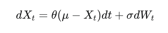 노이즈 N은 환경의 특성에 맞게 선택될 수 있다고 합니다. 관성(inertia)이 있는 물리 제어 문제에서 탐험 효율성을 높이기 위해, 논문에서는 시간적으로 상관관계가 있는 노이즈를 생성하는 Ornstein-Uhlenbeck 프로세스를 사용했다고 합니다. 이 프로세스는 마찰이 있는 브라운 입자의 속도를 모델링해서, 결과적으로 0을 중심으로 시간적 상관관계를 갖는 노이즈 값을 생성한다고 합니다. 저도 이해가 안 돼서 조금 찾아봤는데, 쉽게 말하자면 평균 회귀(mean-reverting) 성질을 가진 랜덤 노이즈인 것 같습니다. 서로 시간적으로 연관되어있고, 평균에서 멀어지면 다시 평균으로 회귀하는, 평균으로 당기는 성질을 가졌다고 합니다. 이는 로봇 팔 제어와 같이 관성이 있는 물리 시스템에서는 행동이 갑자기 크게 변하는 것보다 부드럽게 변하는 것이 더 현실적이고 효과적인 탐험이 될 수 있기 때문에 채택했다고 합니다. 아래와 같은 확률 미분 방정식으로 표현되고, OU 프로세스 Xt의 다음 순간 변화량(dXt)은 현재 값이 평균(μ)에서 벗어난 정도에 비례하여 평균 쪽으로 돌아가려는 힘(θ(μ−Xt)dt)과 랜덤한 노이즈(σdWt)의 합으로 결정된다고 합니다.