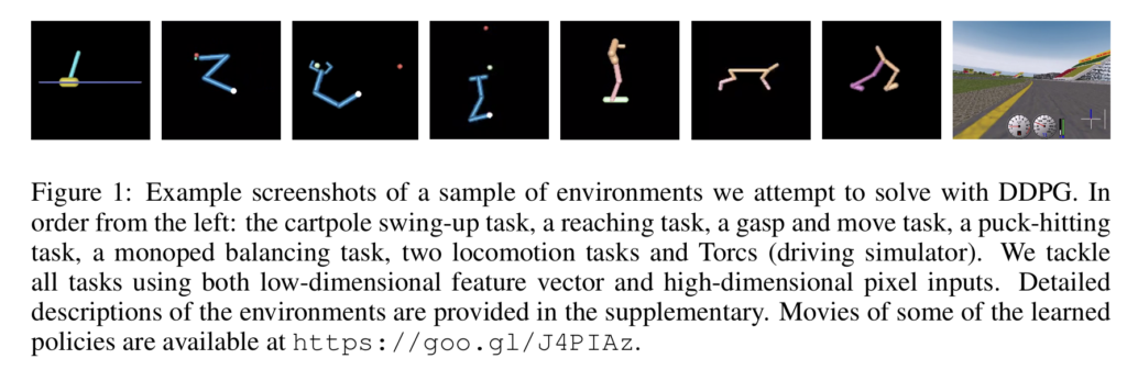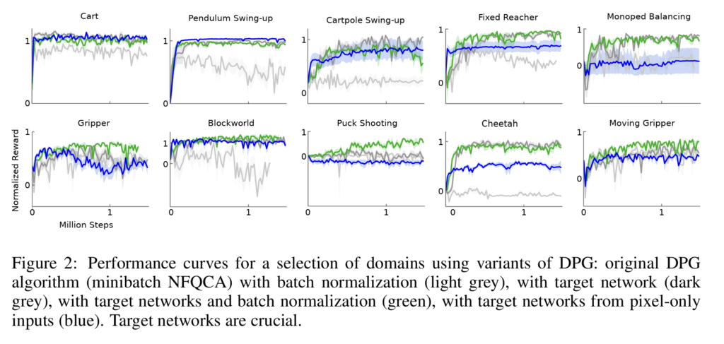 대부분의 강화학습 알고리즘과 마찬가지로, DDPG 역시 비선형 approximator를 사용하기 때문에 이론적인 수렴성이 보장되지는 않는다고 합니다. 주목할 만한 점은, 본 논문의 모든 실험에서 문제 해결에 사용된 experience의 수가 DQN이 아타리(Atari) 게임 영역에서 해답을 찾는 데 사용했던 것보다 현저히 적었다는 사실이라고 합니다. 연구진이 다룬 거의 모든 문제들은 250만 스텝 이내의 경험(대부분의 경우 250만 보다 훨씬 더 적은 스텝)으로 해결되었는데, 이는 DQN이 아타리 게임에서 좋은 성능을 보이는 데 필요한 스텝 수보다 약 20배나 적은 수치였다고 합니다.