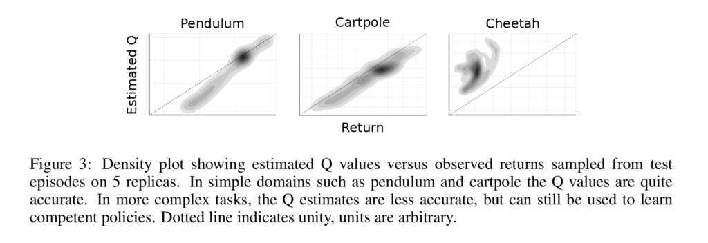 저자는 학습 후 DDPG의 Critic 네트워크 Q가 추정한 return과 실제 테스트 에피소드에서 관찰된 GT return을 비교하여 DDPG의 가치 추정 정확도를 경험적으로 조사했다고 합니다. 아래 figure의 density plot을 통해 확인할 수 있습니다. pendulum 이나 cartpole과 같은 간단한 과제에서는 DDPG가 체계적인 편향 없이 꽤 정확하게 반환값을 추정하는 것을 볼 수 있었다고 합니다. 더 어려운 과제에서는 Q 추정치의 정확도가 떨어지지만, 그럼에도 불구하고 DDPG는 여전히 우수한 정책을 학습하는 데 이 추정치를 효과적으로 사용할 수 있었다고 합니다.