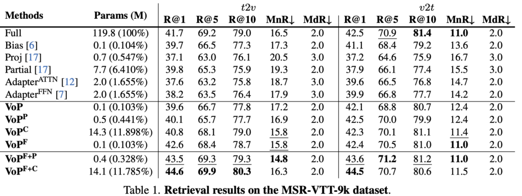 먼저 MSR-VTT-9k 데이터셋에서의 실험 결과를 살펴보겠습니다. 테이블에서는 Full fine-tuning과 Bias만 조정하는 방식, linear projection만 업데이트하는 방식, 마지막 레이어만 조정하는 방식, 그리고 Self-Attention 및 FFN에 Adapter를 추가하는 방식과 비교를 진행합니다.