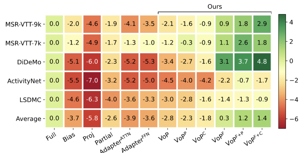 - 벤치마크 실험을 통해 다양한 프롬프트 조합이 VoP의 성능을 향상시키며, full fine-tuning 대비 훨씬 적은 파라미터로 더 나은 성능을 보여줌