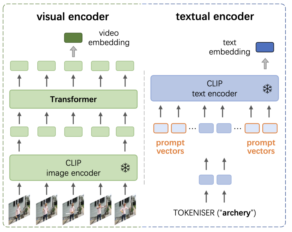 이번 논문은 Prompt Learning 연구 분야에 속하며, CLIP을 활용해 비디오 도메인으로 확장하는 방법을 탐구한 논문입니다. 이전에도 비디오 도메인에서 Prompt 학습 방식이 없었던 건 아닙니다. 2021년 ECCV에 발표된 [Prompting Visual-Language Models for Efficient Video Understanding] 논문에서는 아래 그림과 같이 prompt 벡터를 추가하는 방식을 사용했습니다.
