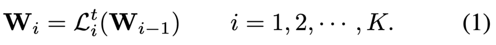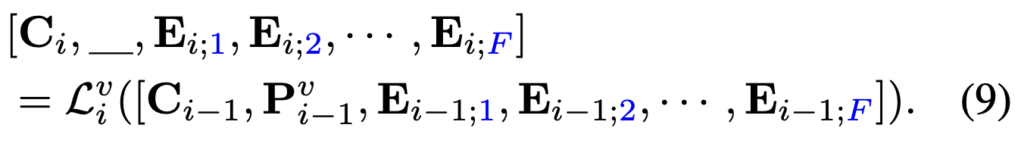 반면 뒤쪽 deep layers(K−Ks개)에서는 단일 프레임이 아니라 비디오 전체, 즉 프레임 간의 시간-공간 관계를 처리하도록 설계됩니다. 이 구간에서는 모든 프레임의 토큰들을 함께 입력으로 사용하며, 이에 맞춰 비디오 레벨의 프롬프트를 적용합니다. 이를 수식으로 표현하면 다음과 같습니다.