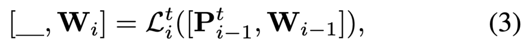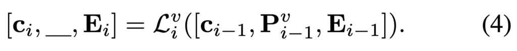 E0는 i번째 레이어에 입력되어 Wi를 얻으며, 이때 CLS 토큰 c와 비주얼 프롬프트 P가 함께 추가되어 레이어 입력으로 사용됩니다.