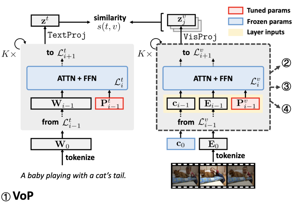 2. 기존 VOP에서 모든 프레임에 대해 동일한 프롬프트를 사용하여 학습이 가능했던 것은, 모델에게 학습 과정을 유도하는 넓은 의미의 프롬프트 활용으로 이해할 수 있습니다. 모델 학습 시 프롬프트 역시 학습 가능한 파라미터로 설정되어, 다른 모델 파라미터들과 마찬가지로 역전파를 통해 손실을 줄이는 방향으로 최적화됩니다.