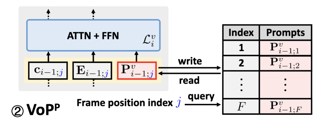 이 방식은 프레임의 시간적 순서를 고려해 프롬프트를 적용하기 때문에 기존 VoP보다 더 세밀한 표현이 가능합니다. 다만, 모든 프롬프트를 위치별로 따로 설정할 경우 파라미터 수가 급격히 늘어나는 문제가 있어, 실제로는 일부 프롬프트만 position-specific으로 설정하고, 나머지는 모든 프레임이 공유하도록 설계해 효율성까지 함께 고려했습니다.