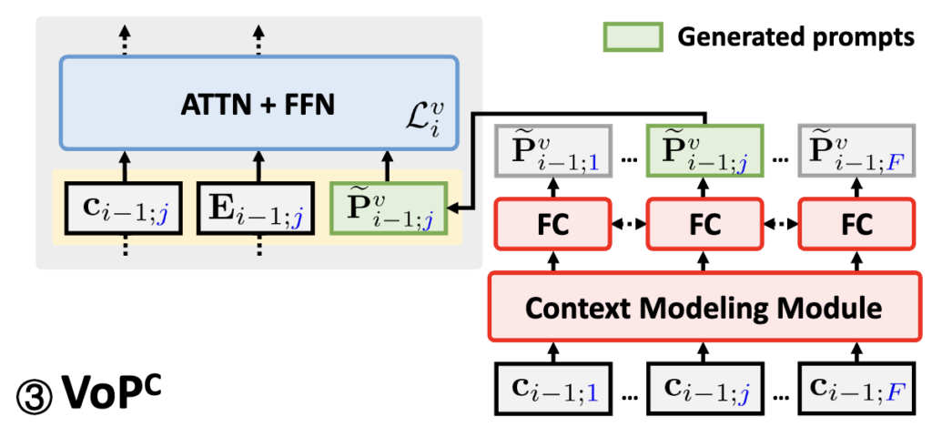 VoPP에서는 프레임의 위치를 고려하여 시간 정보를 반영했습니다. 하지만 프레임의 위치만으로는 비디오 전체의 맥락, 즉 다른 프레임들과의 의미적 관계까지 충분히 반영하기 어렵습니다. 예를 들어, 특정 프레임이 중요한 이유는 단순히 그 위치 때문이 아니라, 앞뒤 장면과의 연관성 속에서 의미가 부여되기 때문입니다. 이러한 문맥(context) 정보를 반영하기 위해 추가된 방식이 VoPC(Context-Specific Video Prompts)입니다.