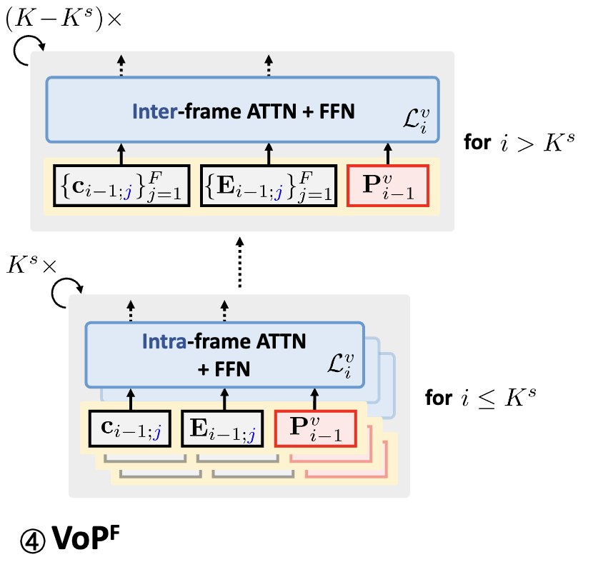 앞쪽 shallow layers(Ks개)에서는 기존과 같이 각 프레임 내 공간 정보(spatial)를 처리하는 데 집중하며, 이 구간에서는 VoPP나 VoPC처럼 프레임 중심의 프롬프트를 그대로 사용할 수 있습니다.