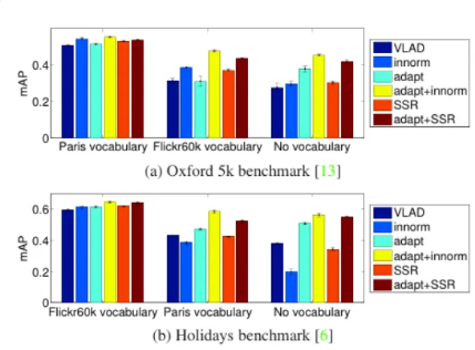 지금은 기본 VLAD 인 네이비색 막대와 adapt를 적용한 민트색 막대를 봐주세요. 모든 경우에서 center adaptation을 적용했을 때 성능 향상을 보입니다. retrieval 에 사용하는 데이터셋과 vocabulary를 만들기 위한 데이터셋이 완전히 다르거나(Holidays – Paris vocabulary) no-vocabulary인 경우 개선된 정도가 더 컸습니다. 자세히 설명 드리자면 Holidays benchmark에 대해서 paris vocabulary에 대해 adaptation을 적용해서 9.7% 향상을 보였지만 Holidays와 상대적으로 유사한 Flickr60k vocabulary에 대해서는 3.2%의 향상으로 비교적 낮았습니다.
