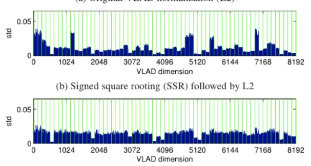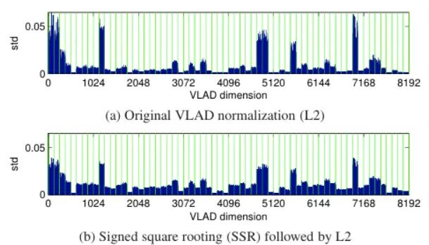 VLAD 가 처음 제안됐을 때 VLAD 벡터는 L2 normalization가 적용됩니다. (VLAD 벡터를 벡터의 크기로 나눠 단위 벡터가 되도록 함) 이후 연구에서는 여기서 더 나아가 Fisher vector에서 사용되던 SSR (signed square rooting)을 VLAD에도 적용하는 것으로 제안됐습니다. 벡터의 각 원소마다 부호는 유지하고 값에 루트를 적용하는 과정입니다. SSR 적용 후에는 동일하게 L2 normalization이 적용됩니다. (이미지 마다 local descriptor의 개수가 다를 수 있기 때문에 정규활를 수행합니다)